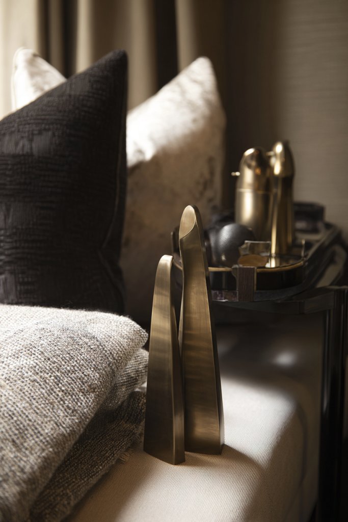 Imagine a brass-trimmed mirror reflecting warm ambient light, or a matte black side table holding a textured ceramic bowl with metallic details. Soft textiles in muted tones are complemented by subtle gold or brass fixtures, adding a layer of luxe. The metallic elements catch the light, creating a gentle shimmer that enhances the cozy atmosphere. It’s elegance with an edge.