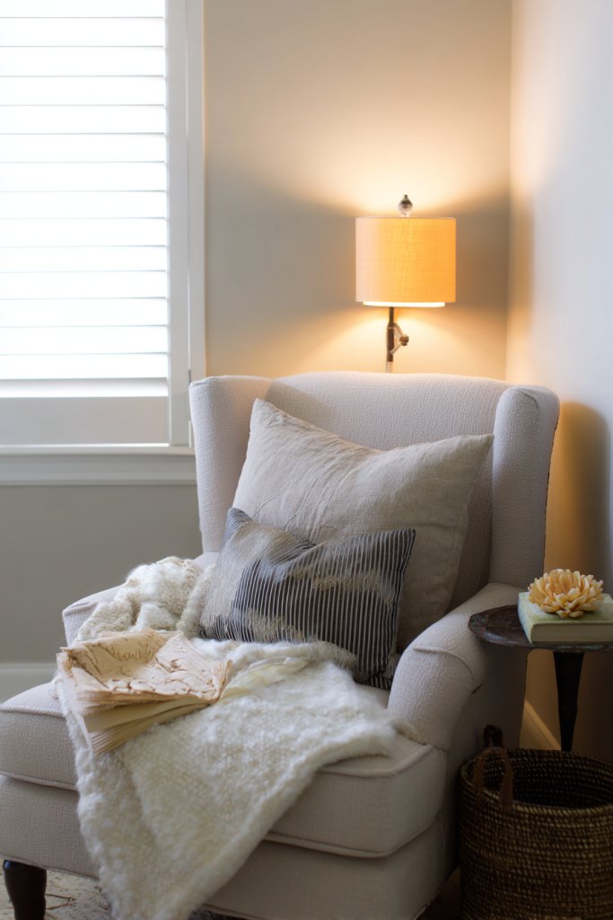 Pick a quiet corner with good natural light or install a wall-mounted reading light. Use a comfortable chair or a built-in bench with plush cushions. Add a small side table for convenience, and layer textiles for warmth and texture. Consider installing textured wall panels or fabric wall hangings for tactile interest, avoiding wall art restrictions. Keep the area tidy with storage solutions for books and accessories. Make it a daily ritual spot.