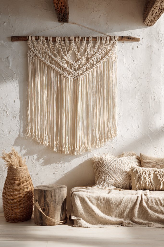 Imagine a large, intricate macramé piece in natural cotton hanging above a cozy sofa or bed. The knotted patterns and dangling tassels create a tactile focal point. The neutral tones blend with various styles, from modern to rustic. When lit softly with ambient lighting, the textures come alive, casting gentle shadows that add depth and interest. It’s like bringing a piece of craft into your home.