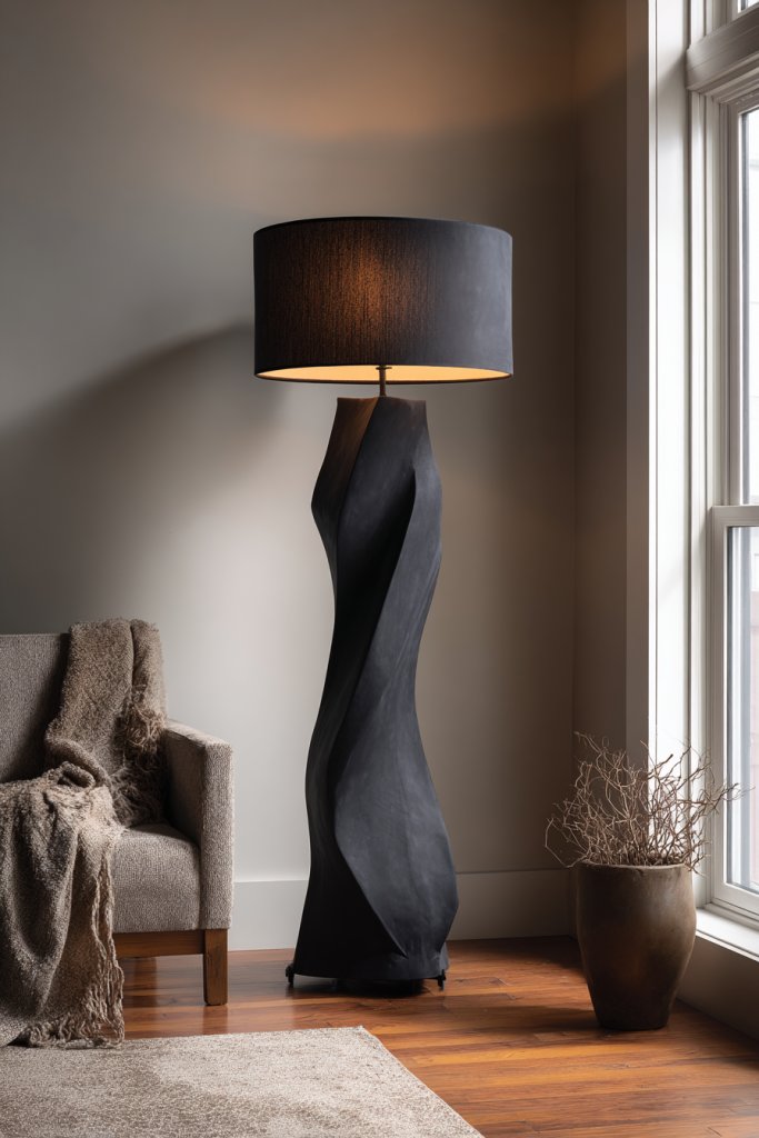 Picture a tall, sculptural lamp with an organic shape or a vintage-inspired tripod with a bold finish. The light casts interesting shadows and creates a cozy glow that enhances the room’s mood. Positioned beside a reading chair or in a corner, it becomes both a practical and artistic feature. The unique base or shade design adds a layer of visual interest, elevating the entire room’s aesthetic.