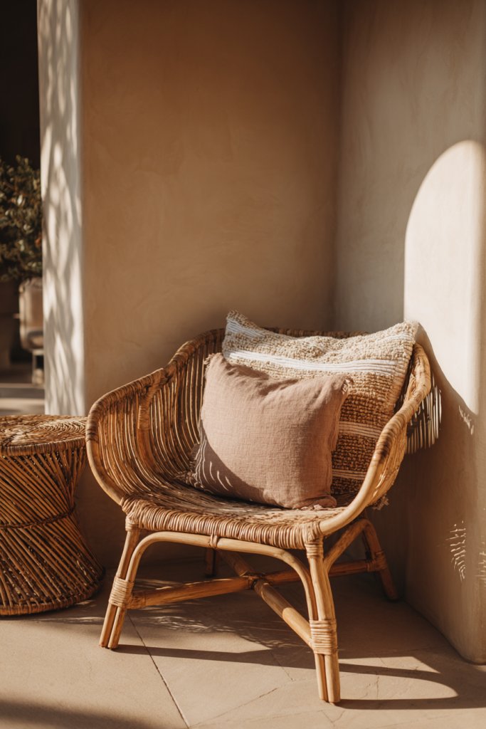 Picture a rattan armchair with plush cushions, placed beside a textured throw blanket. The natural weave adds visual interest and tactile comfort. Wicker baskets and side tables blend seamlessly into the decor, offering both function and style. These elements glow softly in natural light, emphasizing their craftsmanship. They evoke a breezy, vacation-like feeling that’s both charming and cozy.