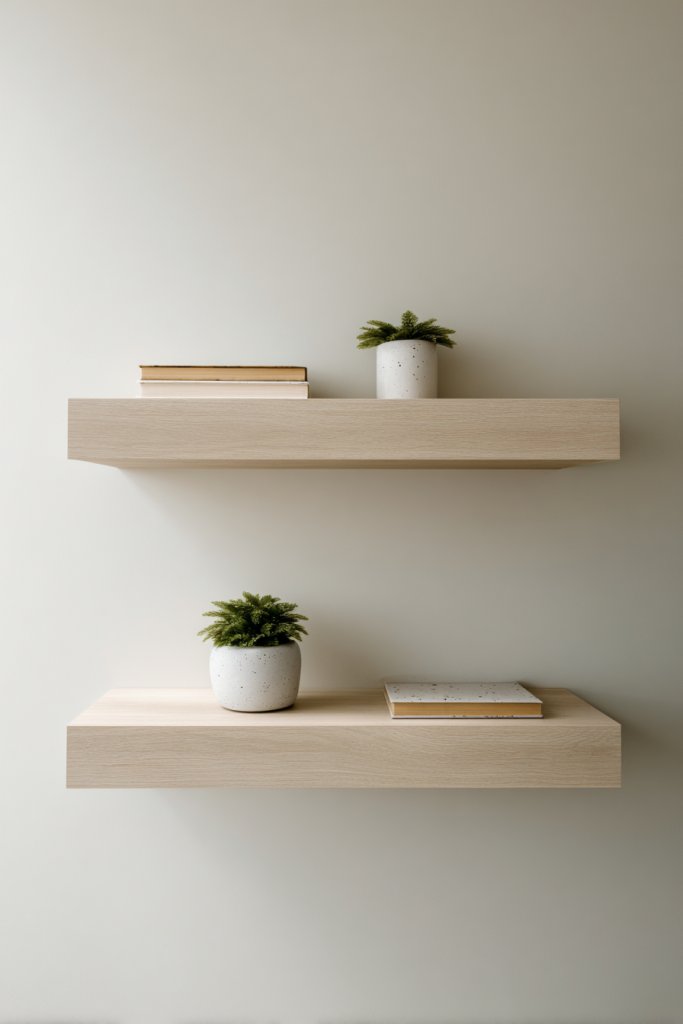 Mix and match shelf lengths and finishes—white, wood, or black—to suit your decor theme. Use them in kitchens for spices, in bedrooms for accessories, or in living rooms for books and decor. Incorporate brackets or hidden supports for a seamless look. During seasonal updates, change the accessories to reflect your mood or trends. Combine with other wall decor for a layered, curated effect.