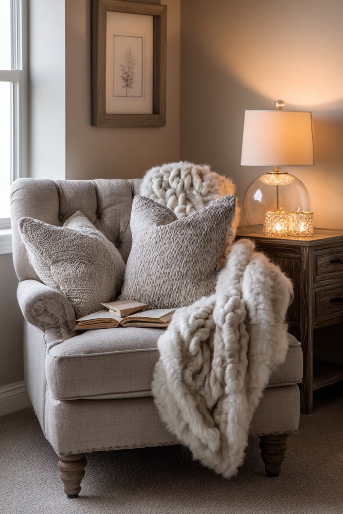 Picture a plush armchair with a soft cream throw draped over the back, nestled beside a small side table holding a cup of tea and a candle. The area is layered with textured cushions and a small rug underneath. Soft lighting from a nearby floor lamp or wall sconce creates a warm glow. The space feels inviting and personal, perfect for lazy afternoons or quiet mornings. It’s your little corner of peace.