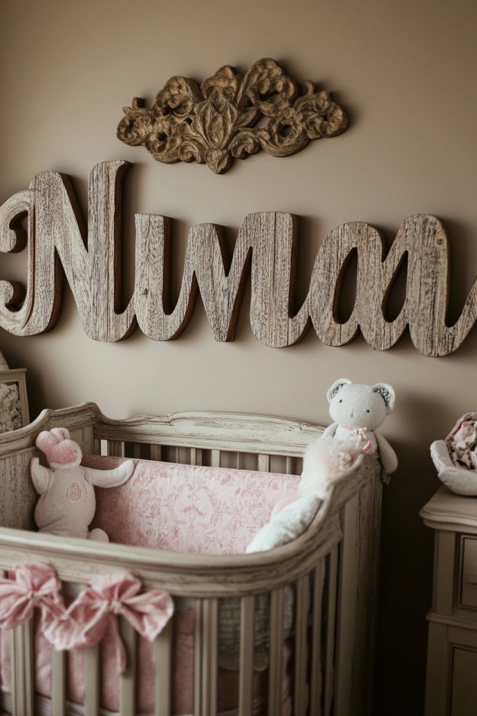 Picture soft fabric letters spelling out your baby’s name, hung above the crib or on a feature wall. The letters might be stitched, painted, or made of textured textiles, adding tactile interest. Surround the name with subtle decorative elements like fabric flowers, bows, or soft garlands. It creates a focal point that’s both charming and personal.