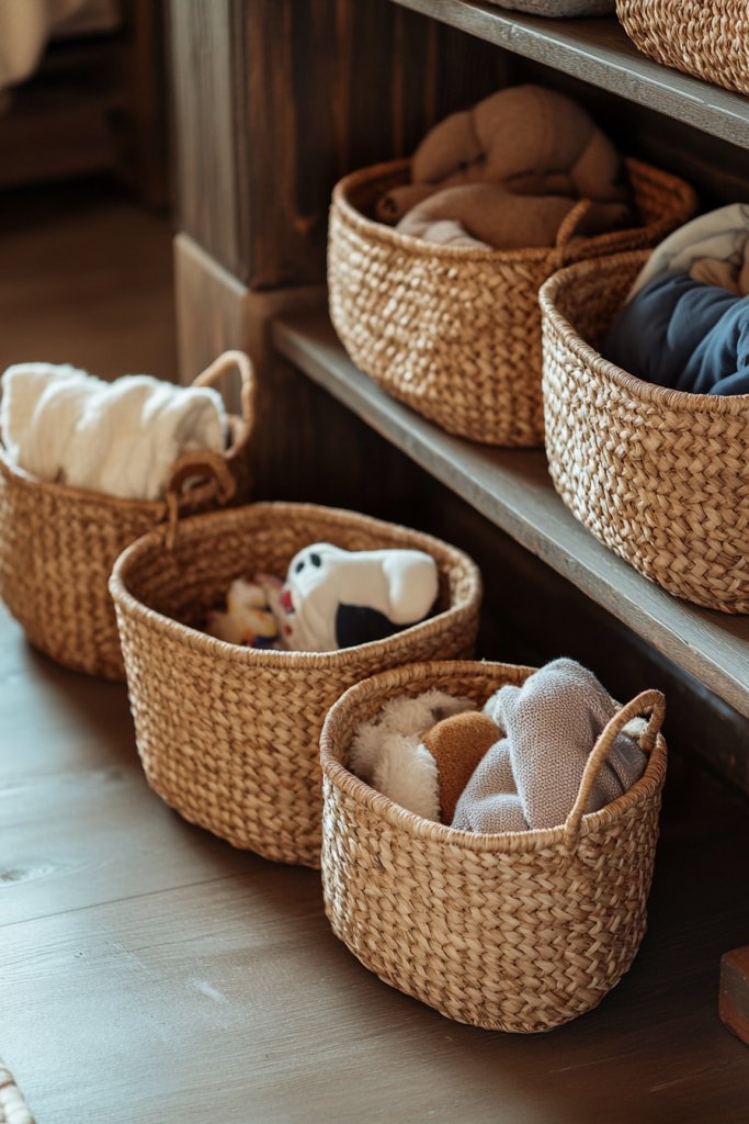 Imagine a set of open-top baskets in muted tones, filled with soft toys, diapers, or baby clothes. They sit neatly on open shelves or under changing tables, blending seamlessly with the room’s aesthetic. The natural fibers add a tactile element that invites touch and complements textiles and woods.