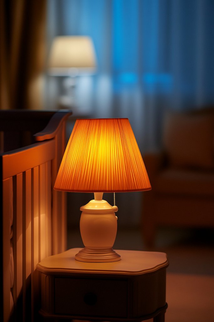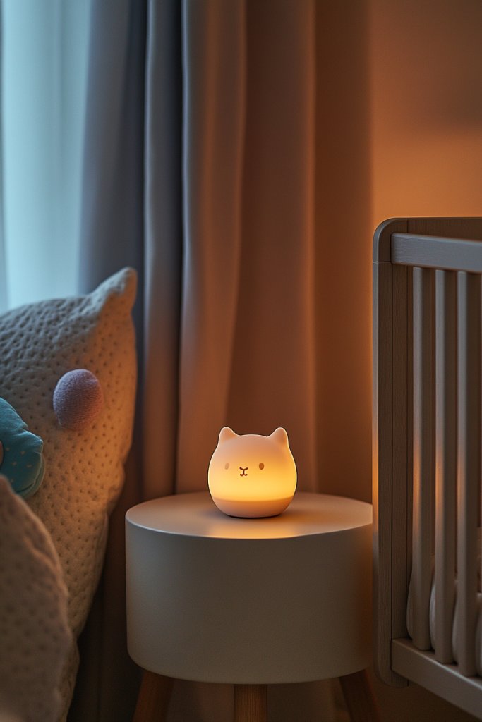 Visualize a small, unobtrusive nightlight mounted near the crib, emitting a warm, amber or pastel hue. The soft light casts a gentle glow over the room, avoiding sharp shadows and harsh brightness. It creates a soothing ambiance that encourages relaxation and sleep for your baby. The light’s design is simple yet charming, blending with your nursery decor.