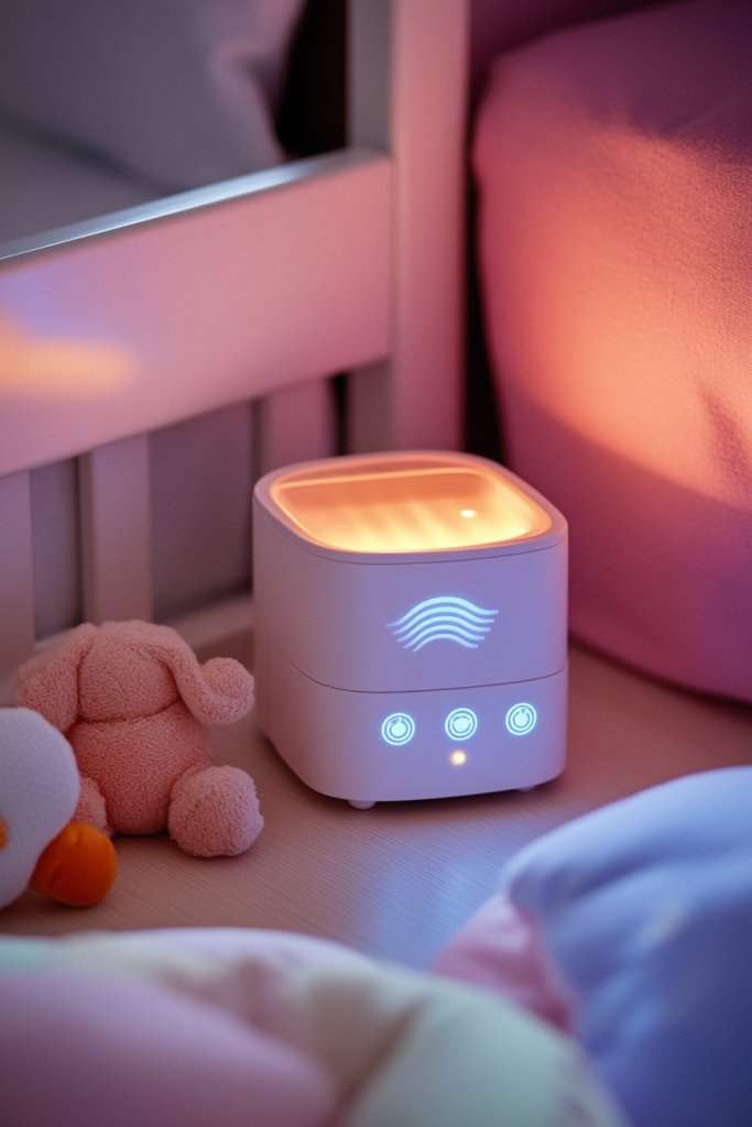 Picture a small, sleek sound machine placed on a bedside table or mounted discreetly on the wall. It emits a soft, consistent hum that mimics the gentle rush of wind or lullabies, filling the room with a comforting soundscape. Its subtle glow adds to the ambiance without disturbing sleep, while the gentle white noise creates a cocoon of calm. The device’s compact design blends seamlessly into your nursery decor.