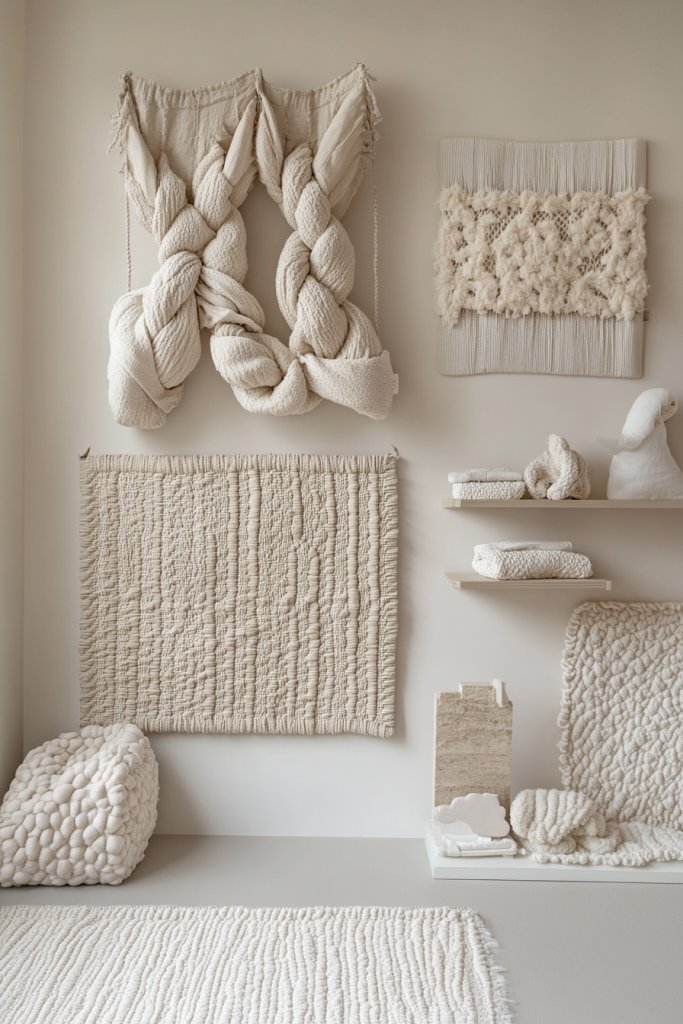 Imagine soft fabric wall hangings, subtle woven wall panels, or textured wall decals that add visual interest without chaos. These elements bring tactile richness to the room—think plush, knotted fabrics or raised patterns that invite touch. A neutral palette with gentle textures creates a serene backdrop, making everything feel harmonious and soothing. These pieces subtly catch the eye, adding warmth without clutter.