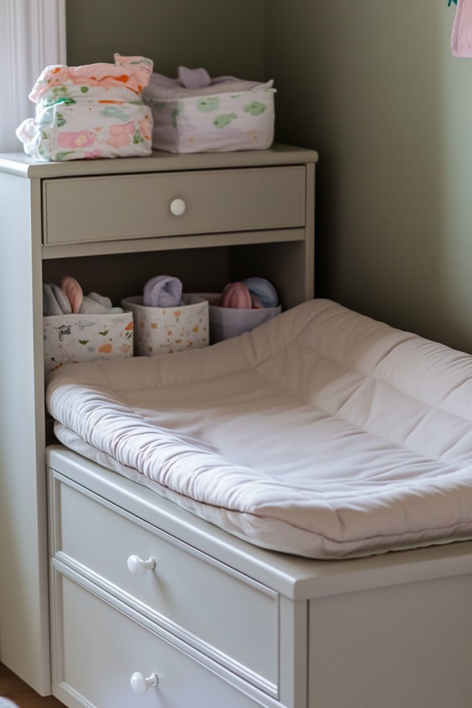 Personalize your changing station with custom labels or fabric accents that match your nursery decor. Use soft, plush toys or sensory elements nearby to distract your baby during changes. Incorporate a small mirror or a framed photo for a personal touch. Keep everything at a comfortable height and within reach to make diaper changes smoother and more enjoyable.