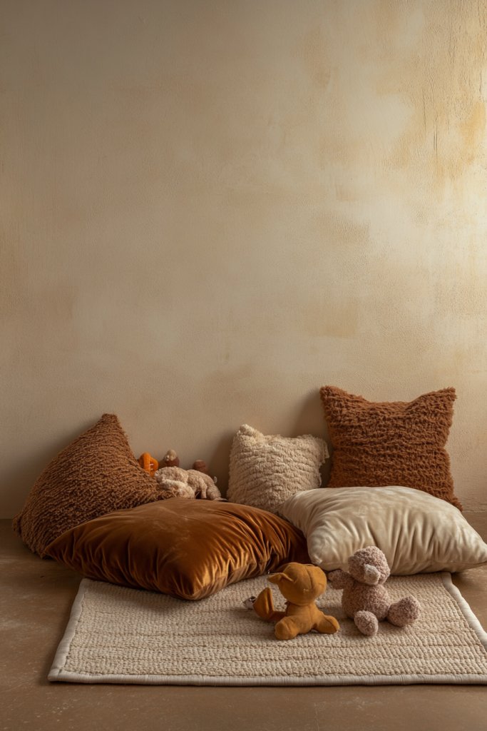 Imagine a corner filled with plush cushions, padded mats, and soft toys in gentle hues. The cushions are textured—think knits, velvets, or faux fur—that invite tactile exploration. A few plush animals or textured balls complete the scene, all arranged on a soft, washable rug. The space exudes warmth and safety, making it perfect for quiet play or reading stories together.