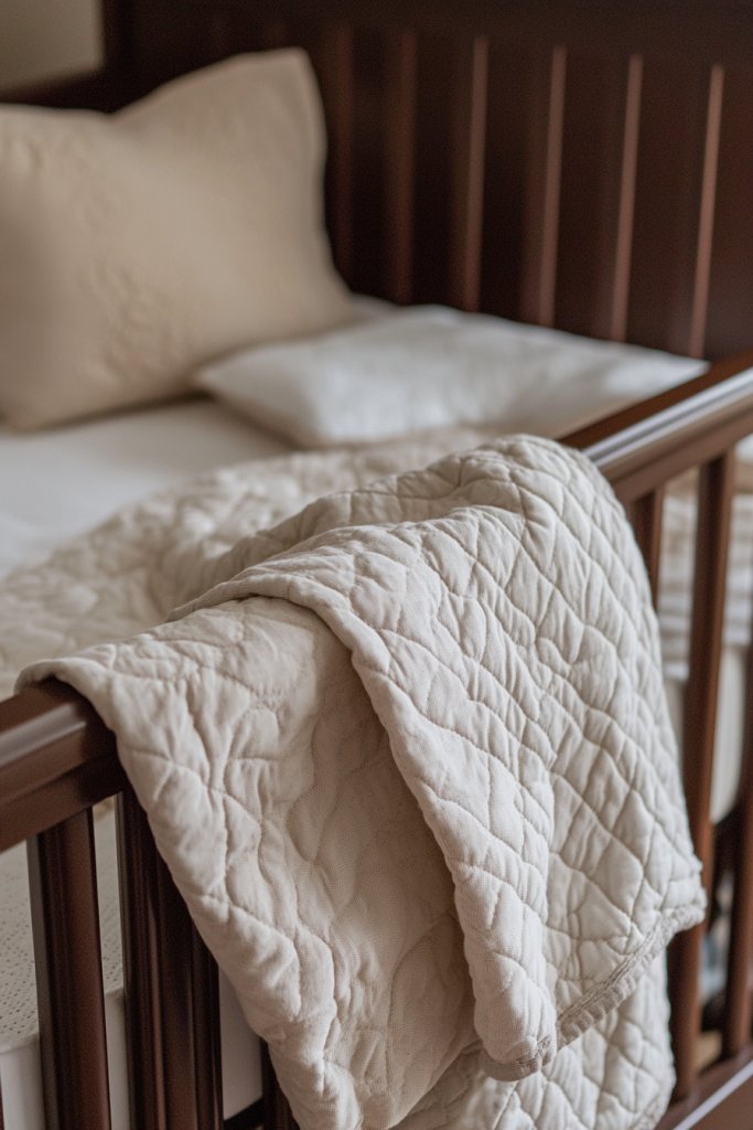 Picture a sturdy, sleek crib dressed in breathable, hypoallergenic sheets in gentle fabrics like organic cotton or bamboo. Layered with a light canopy or soft quilted bedding, it creates a nest-like feel. Small details like embroidered initials or custom appliqué add a personal touch. The bedding’s textures and colors blend seamlessly with the room’s overall palette.