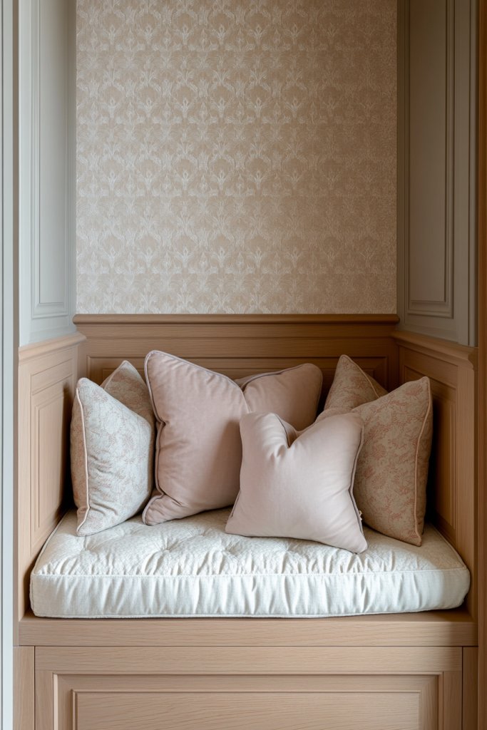 Visualize a recessed wall section filled with soft, plush cushions in gentle colors, topped with a cozy throw. A small shelf above holds favorite storybooks or keepsakes, while the surrounding wall might feature subtle textured wallpaper or painted accents. This creates a visual focal point that invites both parent and child to relax.