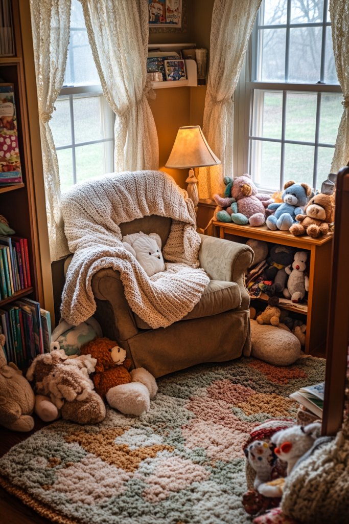Picture a soft, oversized armchair or a comfy bean bag nestled into a corner, layered with fuzzy throws and cushions. Nearby, a small side table holds books and a gentle nightlight. The area is enveloped in warm textiles—think plush rugs and cozy fabrics—that invite you to sink in and relax. It’s a space designed for calm and connection.