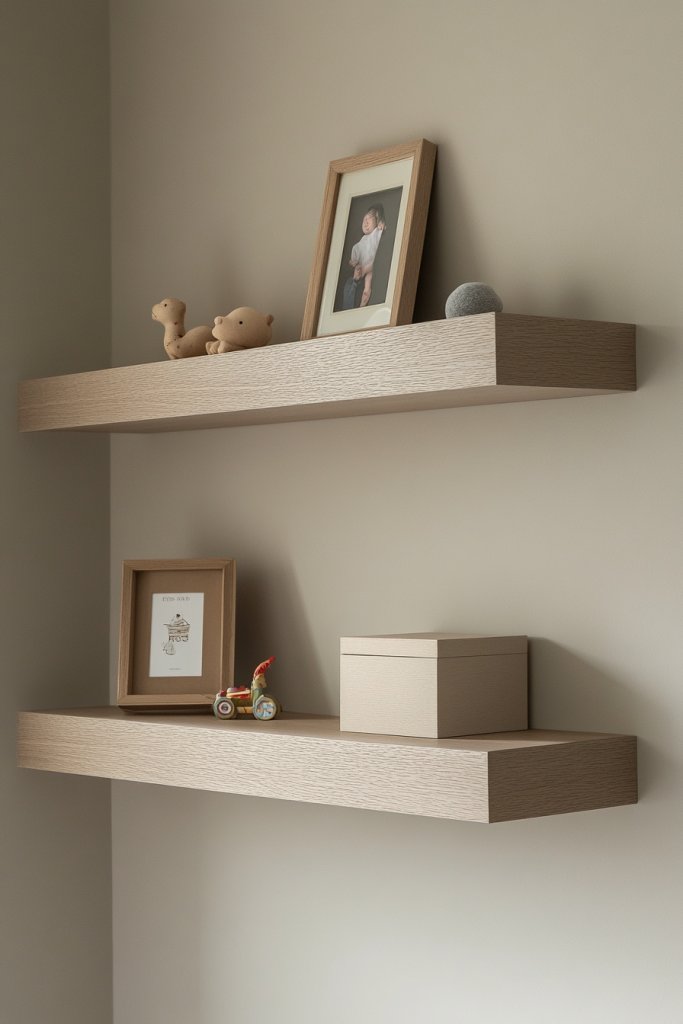 Envision sleek floating shelves in a natural wood finish or painted in soft colors that blend with the nursery’s theme. They hold neatly stacked baskets, soft toys, or decorative items like plush animals or fabric bins. The open design keeps everything accessible while adding visual interest to the walls.