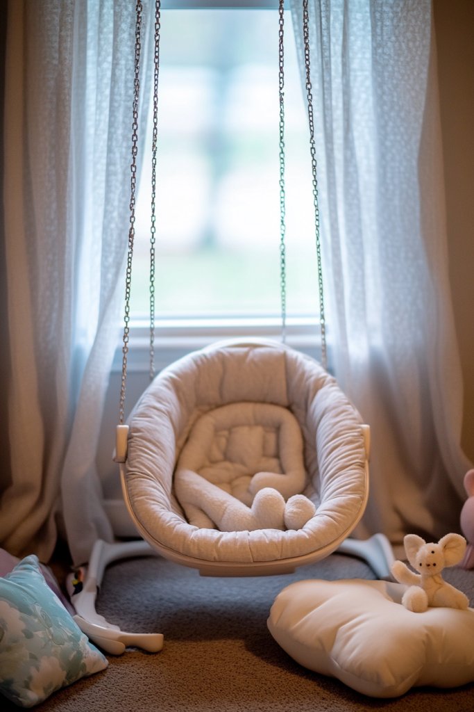 Picture a plush, cushioned swing in a muted pastel shade, with a removable, washable cover. It gently sways as soft fabrics ripple with movement, creating a calming motion. Nearby, a small plush toy or soft blanket adds tactile comfort. The entire setup exudes warmth and ease of maintenance.