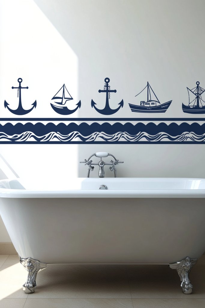 Dreaming of coastal breezes and ocean views? Nautical decals can bring the seaside into your bathroom without any of the hassle of actual saltwater or sand. They’re perfect for beach lovers or anyone craving a calming maritime vibe. Who says you can’t have the ocean right outside your shower?