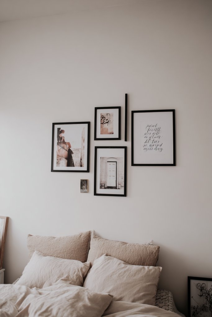 Picture a gallery wall of minimalist black-and-white photos or framed motivational quotes in elegant typography. The artwork is arranged in a balanced, cohesive layout that draws the eye and adds visual interest. Soft lighting highlights the pieces, creating a calming, inspiring environment. The room feels more personal, lively, and welcoming.