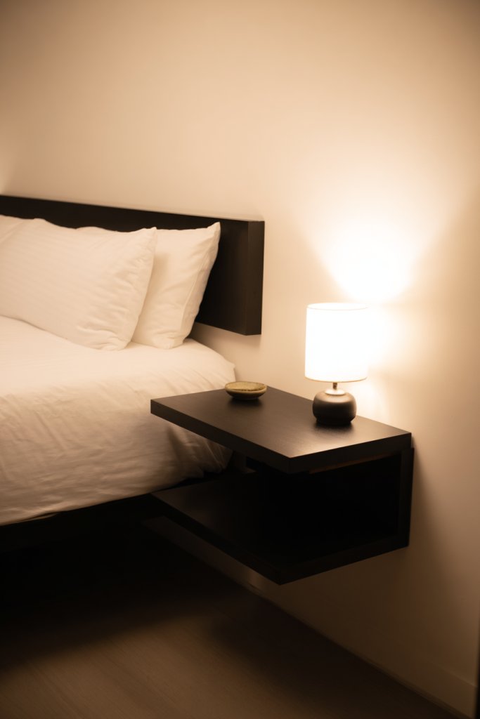Picture a pair of floating tables mounted on either side of the bed, in a matte black or soft wood finish. They hold minimal essentials—a small lamp, a book, or a decorative object—without crowding the space. The absence of legs makes the room appear larger, while lighting casts warm glows on textured bedding. The overall vibe is minimalist and modern.