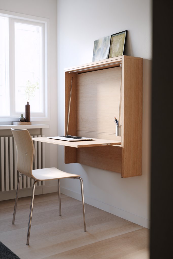 Envision a sleek, fold-down desk in a neutral finish that swings down from the wall when needed. When folded up, it becomes a clean wall surface, keeping the room open. When open, it reveals a tidy surface with organized storage underneath for makeup or stationery. Soft lighting nearby creates a cozy, practical workspace.