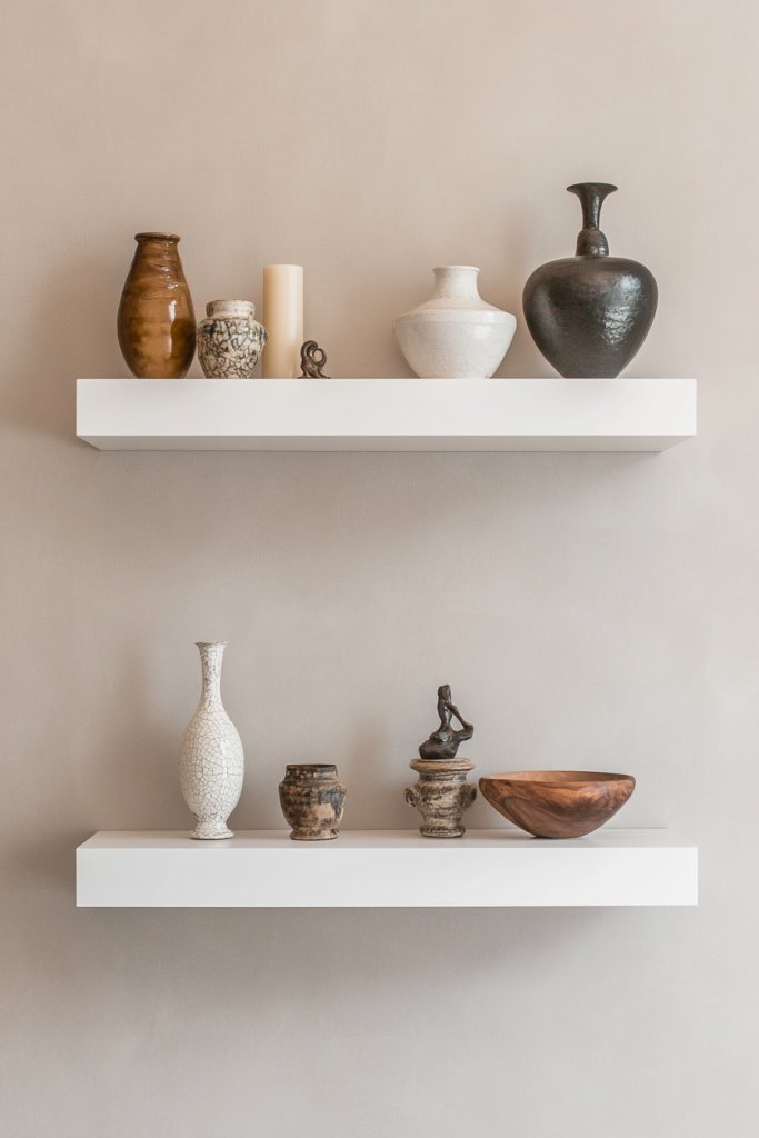 Arrange shelves asymmetrically for a dynamic look or symmetrically for balance. Use different depths and lengths to add visual variety. Decorate with a mix of functional and decorative items—books, candles, plants (if you choose to include greenery), and artwork. Change items seasonally to keep your space fresh and interesting.