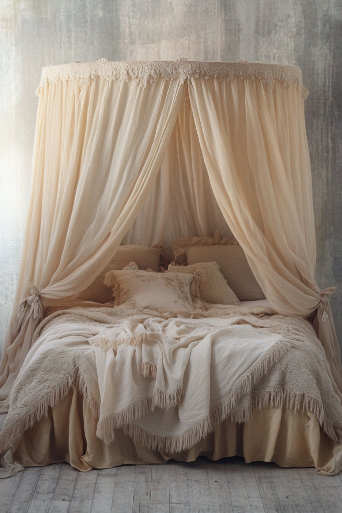 Picture a lightweight, sheer canopy draped over your bed, with flowing fabric in earthy tones and subtle patterns. Alternatively, a large woven tapestry with intricate designs hangs behind your bed, serving as a stunning backdrop. The fabric or textile adds softness and a layered look that invites relaxation. The overall effect is cozy and bohemian, perfect for unwinding.