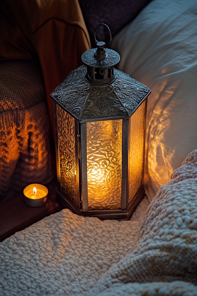 Picture a vintage-style lantern with a flickering LED candle or a textured ceramic lamp with a soft glow. These sit on your nightstand or hang from the ceiling, casting gentle pools of light. The textured surfaces and warm tones add a layer of visual richness to your space. The subtle lighting makes your room feel warm, inviting, and perfect for unwinding.
