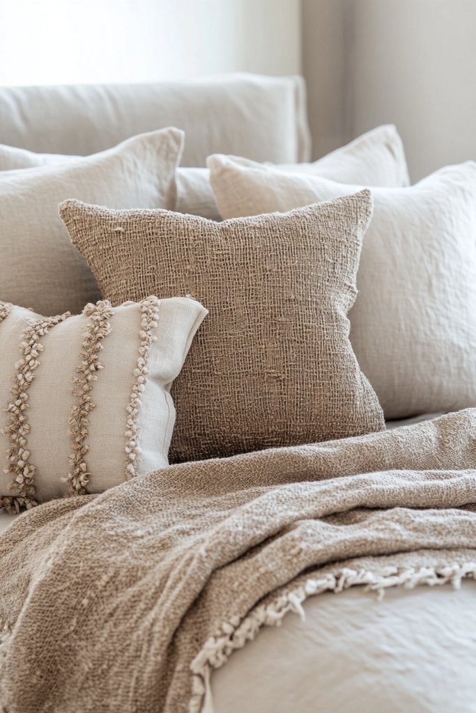 Layer different textures and shades—think smooth linen with rougher jute or soft cotton with textured weaves. Incorporate subtle patterns or keep them plain for a minimalist look. Switch out seasonal throws—lighter linen or cotton for summer, plush or wool for winter. Match your palette with neutral or earthy tones for a cohesive aesthetic.