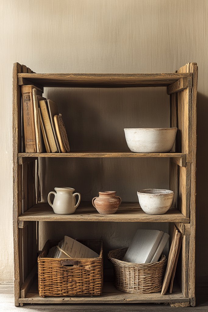 Mix open shelving with closed storage for a balanced look. Use different sizes and finishes—light oak, distressed, or painted—to add visual interest. Incorporate baskets or fabric-lined boxes inside crates for hidden organization. Arrange items thoughtfully, balancing functional objects with decorative touches. Suitable for bedrooms, living rooms, or entryways.