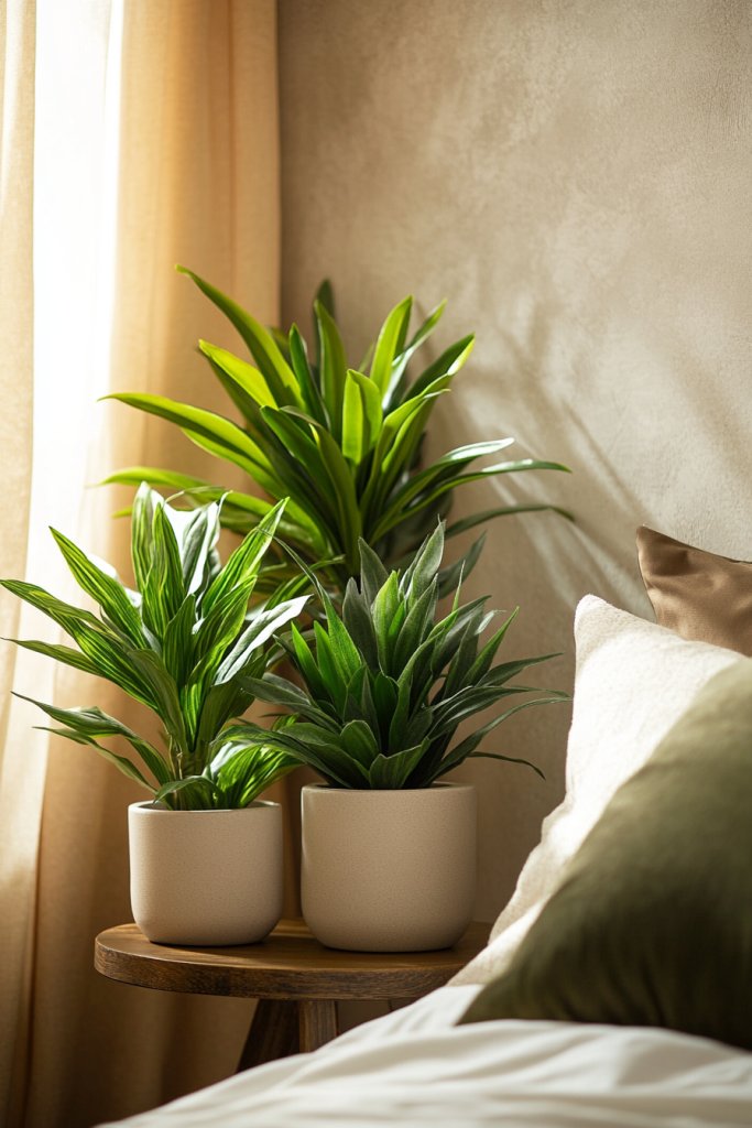 Use different types—succulents, ferns, or tropical leaves—in varied containers for visual diversity. Place them on shelves, windowsills, or corner stands to create focal points. Mix realistic faux with real low-light plants if desired, but keep maintenance low. Rotate or swap out plants seasonally for variety. Keep the containers simple or decorative, matching your aesthetic.