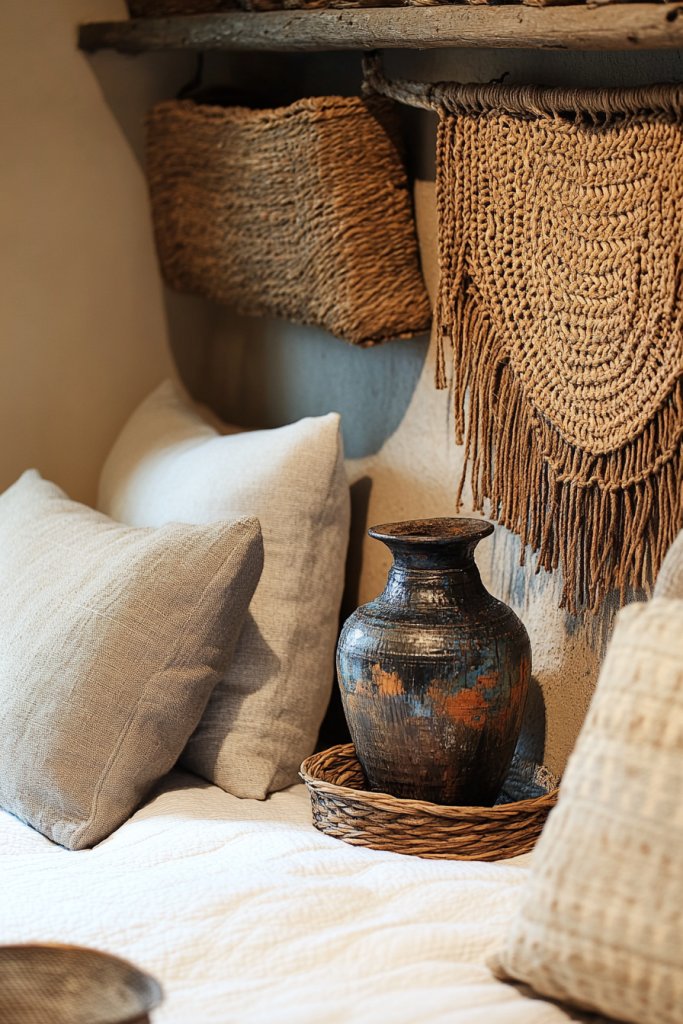 Decorate with woven textiles or layered throws that match your aesthetic. Incorporate subtle metallic accents, like brass lamps or fixtures, to add a touch of sophistication. Use bedding in soft, earthy tones to maintain the organic vibe. Personal touches like vintage suitcases or woven baskets can tie the whole room together.