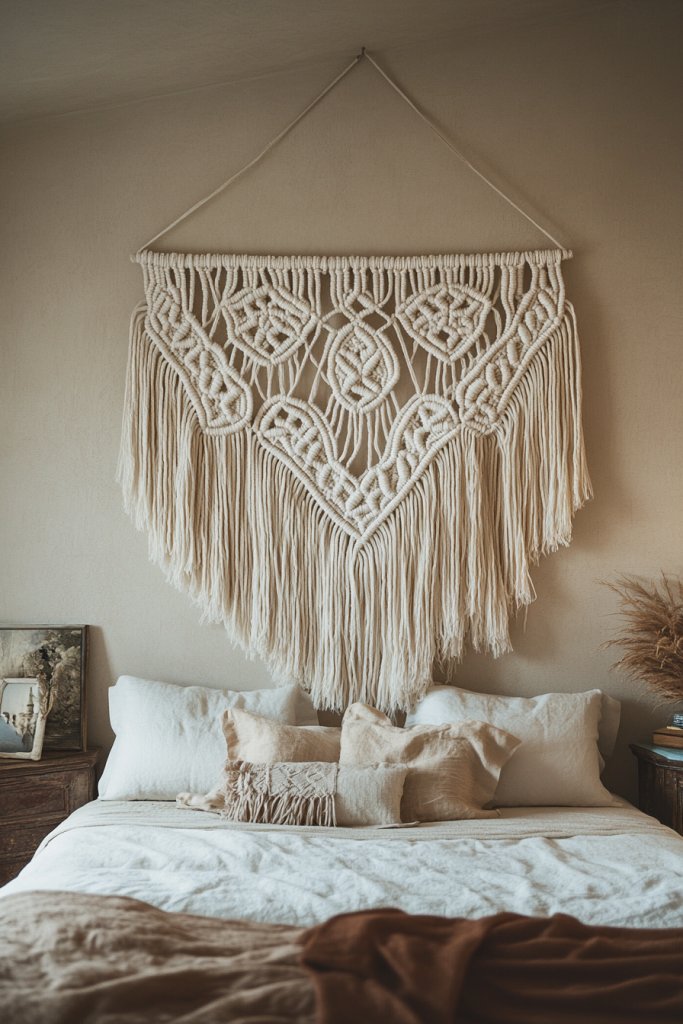 Picture a large, intricate macramé piece hanging above your bed, with knotted tassels cascading down like a waterfall of textured fabric. The creamy fibers contrast beautifully against a neutral wall, adding depth and visual interest. The natural fibers catch the light, creating shadows that dance softly across your room. The handcrafted details make it clear someone put love into every knot.