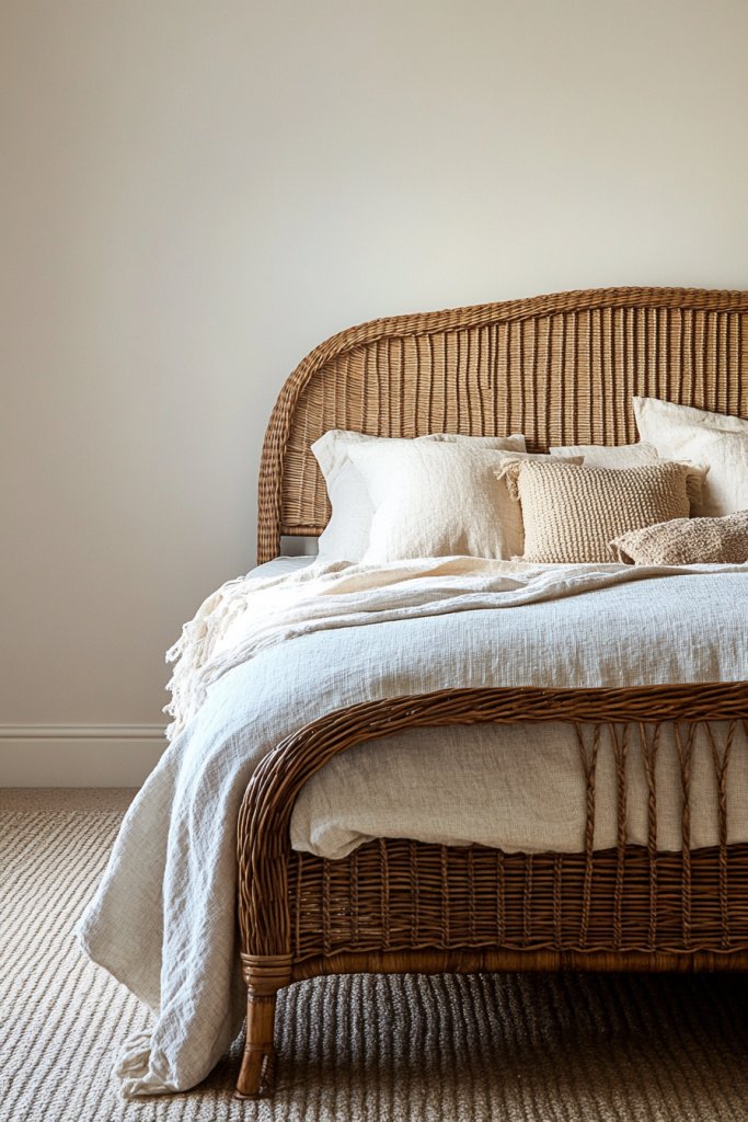 Choose a sleek low-profile frame for a minimalist look or a high, intricate headboard for more visual interest. For a coastal vibe, pair the bed with linen bedding and light-colored accents. In colder months, layer with textured throws and plush pillows—just avoid heavy, dark fabrics that clash with the airy feel. You can also add matching rattan nightstands or storage baskets to complete the look.