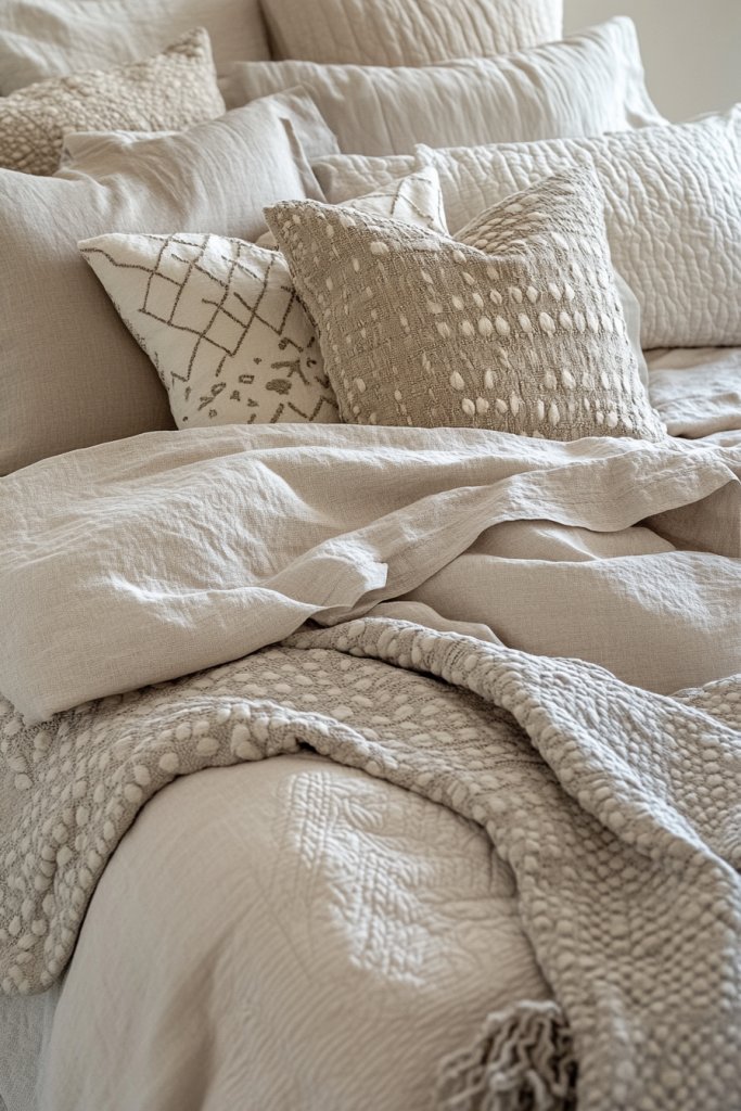 Imagine a bed dressed with a crisp white duvet topped with a textured, patterned throw in soft taupe and cream. Add a mix of pillows—some embroidered, some with subtle geometric prints—creating a harmonious yet layered look. The textures and patterns play off each other, making the bed a focal point of calm and elegance. The neutral palette ensures versatility and timeless appeal.