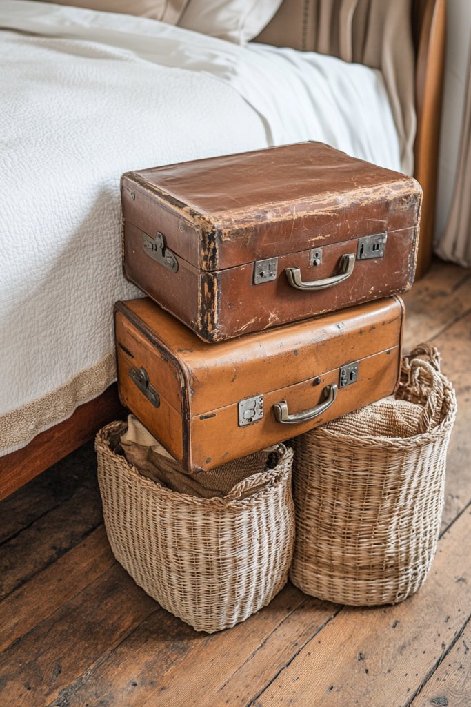 Mix and match different sizes and styles of suitcases for a layered look. Use baskets in various natural fibers—rattan, seagrass, or cotton—to suit your aesthetic. Incorporate labels or tags for functional organization. For seasonal updates, swap out items stored inside to keep the room fresh. They work well with boho, rustic, or vintage-inspired decor.