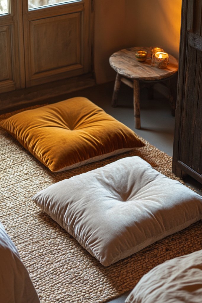 Imagine oversized cushions in soft, earthy tones scattered across a wooden floor, inviting you to sink in. Textured fabrics like velvet or chunky knits add tactile richness. The cushions vary in size, creating a layered, casual look that’s both functional and stylish. A small side table or woven basket nearby completes the laid-back vibe.