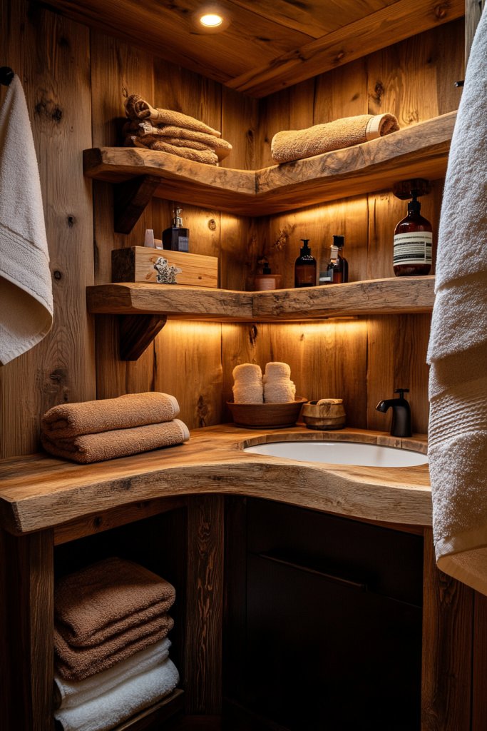Picture reclaimed wood shelves with a slightly rustic finish, paired with a wooden vanity that shows off natural grains. The warm tones contrast beautifully with cool tiles or painted walls. Soft, tactile textures invite you to touch, while the earthy hues set a calming tone. Ambient lighting casts a gentle glow on the wood, enhancing the cozy vibe.