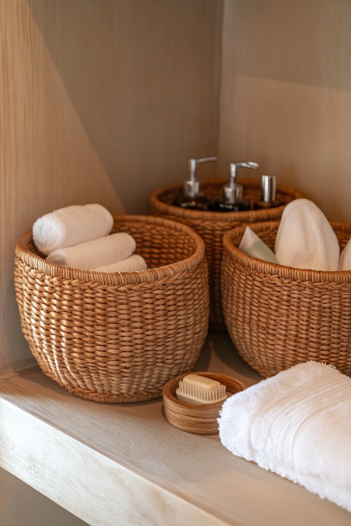 13. Add Woven or Rattan Storage Baskets for Functional Decor