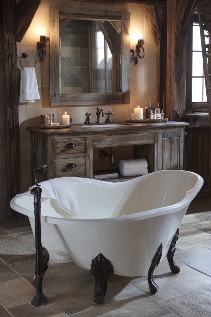 Picture a clawfoot tub with a patina finish, paired with a reclaimed wood vanity. The vintage curves and rustic textures add warmth and character. Soft, ambient lighting highlights the antique details, creating a cozy atmosphere. The combination of old-world charm and modern comfort makes every bath a spa experience.