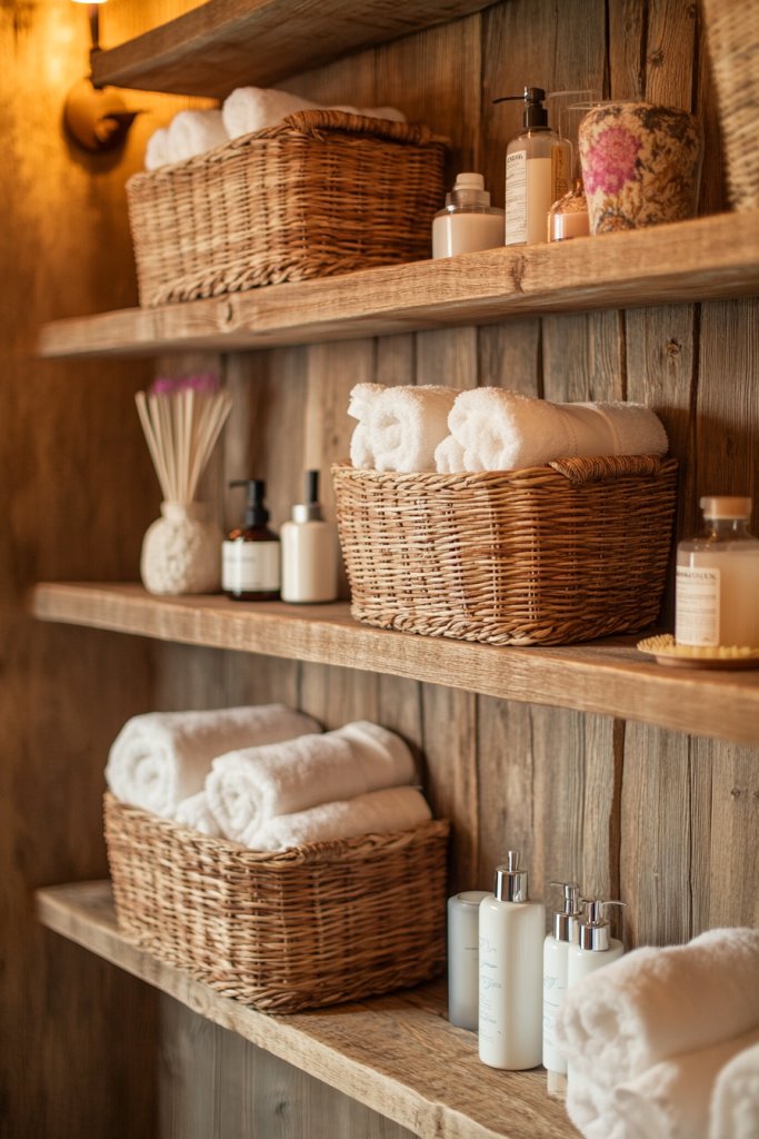 Picture floating wooden shelves mounted on a wall, lined with neatly stacked baskets filled with rolled towels, toiletries, or accessories. The natural fibers of the baskets contrast beautifully with smooth tiles or painted walls. The open display invites a relaxed, airy feeling, making the space feel larger and more inviting. Soft lighting behind the shelves enhances the textured look.