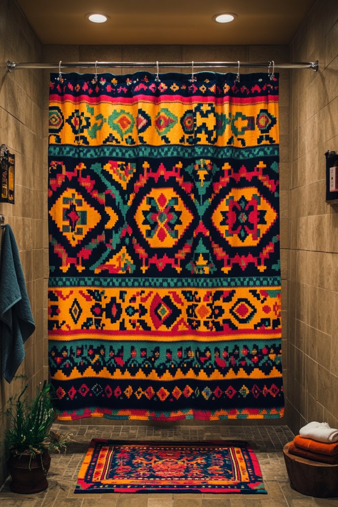 Imagine a shower curtain with tribal geometric prints or vibrant floral patterns that pop against neutral tiles. The fabric drapes softly, creating movement and energy. When light filters through, the colors come alive, energizing the entire room. Layered textures and patterns make the space feel layered and curated.