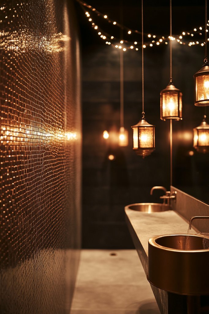 Imagine delicate pendant lights hanging above the vanity, casting a soft amber glow. String fairy lights drape along the ceiling or mirror frame, adding subtle sparkle. The warm light diffuses gently, softening sharp edges and highlighting textures. The overall effect is warm, intimate, and relaxing.