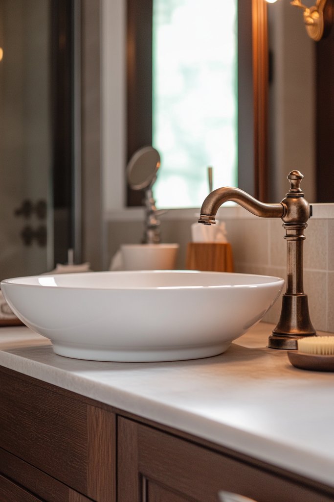 Picture a sleek modern faucet paired with a vintage-inspired brass handle. A contemporary vessel sink sits on a rustic wooden vanity, blending textures and eras seamlessly. The contrast draws the eye and adds layers of visual interest. The mixture of finishes—matte, shiny, distressed—creates a curated, lived-in vibe. The overall look is effortlessly chic.