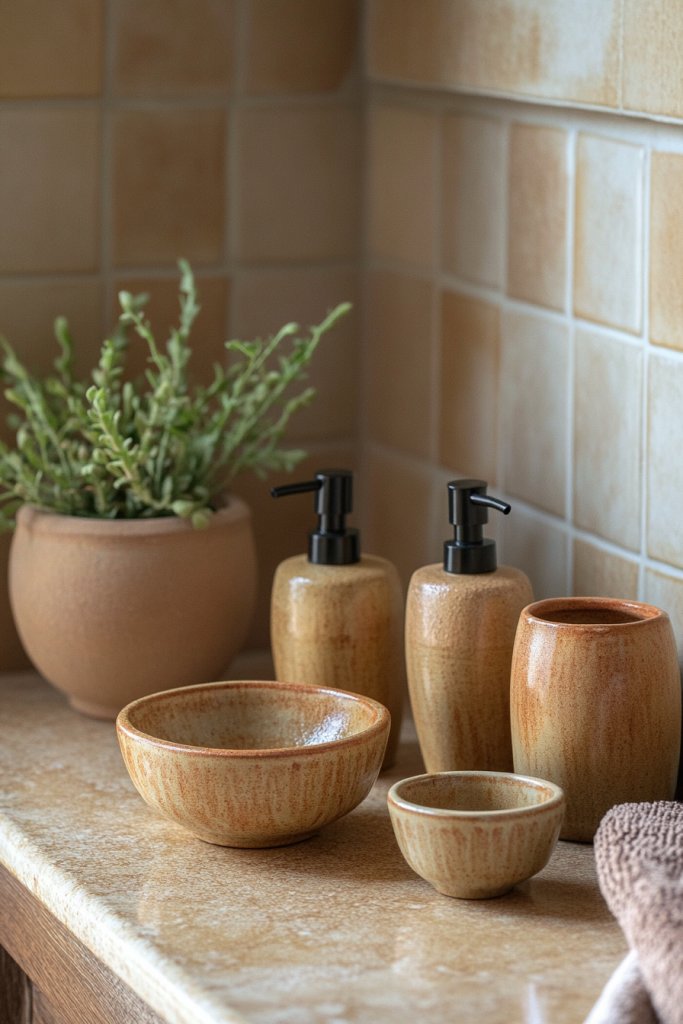 Visualize colorful ceramic jars and soap dishes with intricate patterns sitting on shelves or countertops. Terracotta planters, even if empty, add a rustic charm that complements wood and woven textures. The matte finishes and warm tones create a cozy, inviting atmosphere. These accessories catch the eye without overwhelming the space.