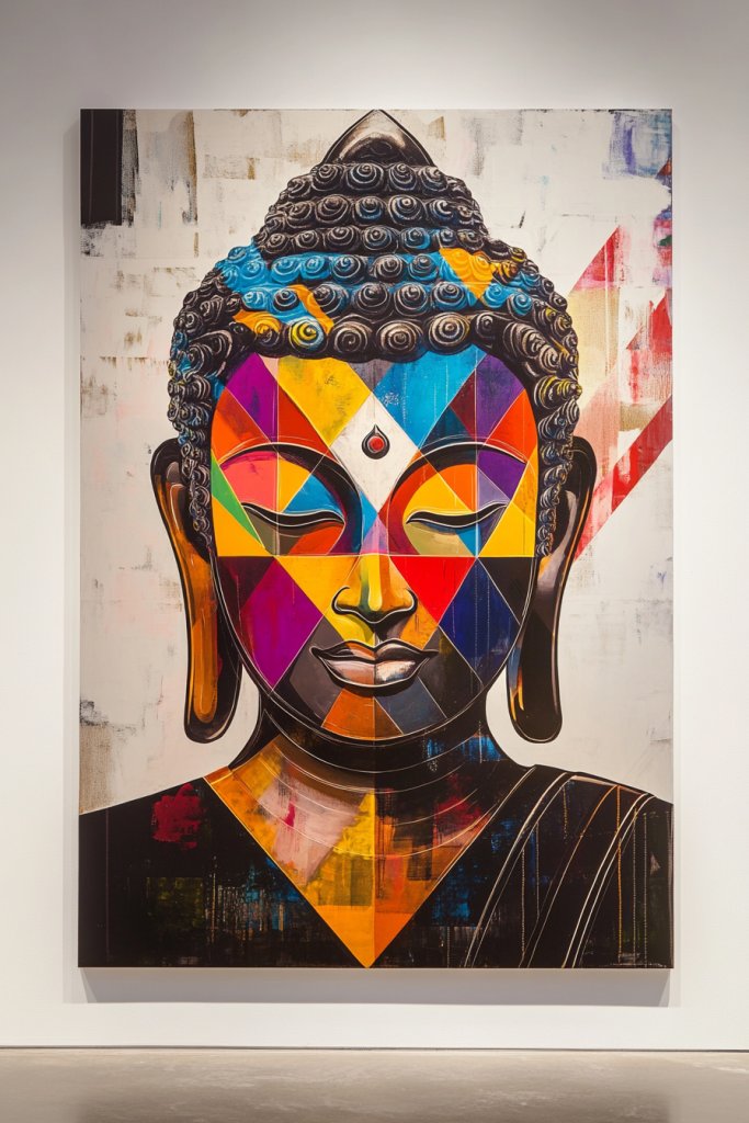 Modern geometric Buddha art proves that spirituality can be chic and current. It’s a bold way to introduce mindfulness into your decor with a contemporary twist. Creating your own design or choosing a striking piece boosts confidence in your personal style. Ready to redefine sacred art?
