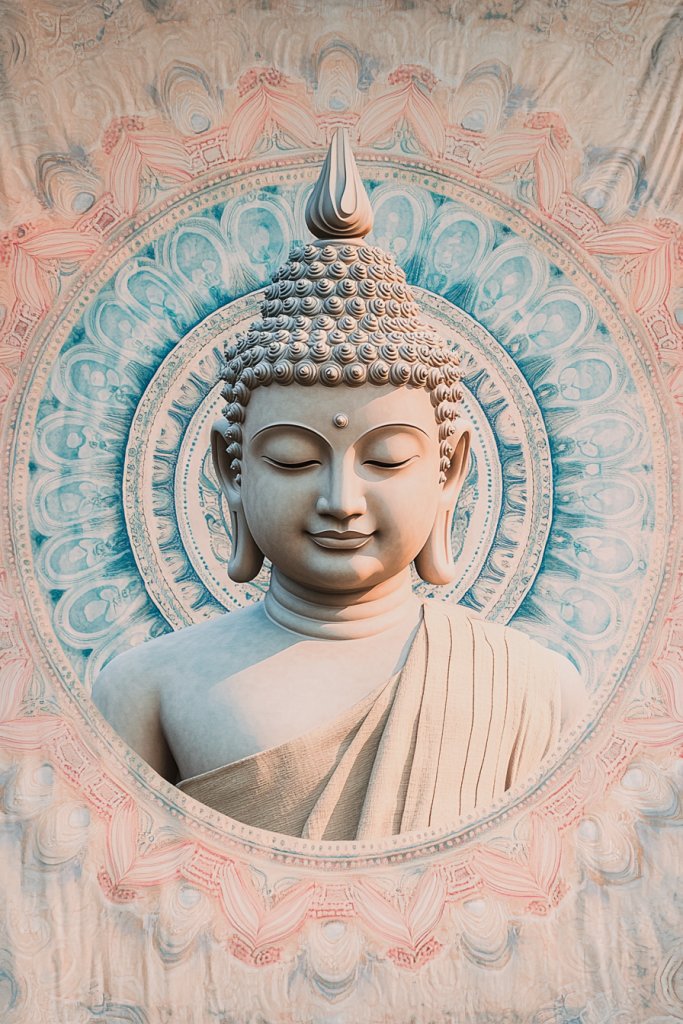 Imagine a Buddha figure centered against a detailed mandala filled with symmetrical patterns, delicate lines, and gentle colors like blush pinks, cool blues, or soft lavenders. The mandala’s intricate design draws your eye inward, creating a sense of balance and spiritual connection. The Buddha’s serene expression anchors the composition, inviting contemplation and mindfulness. The overall aesthetic is tranquil and harmonious.