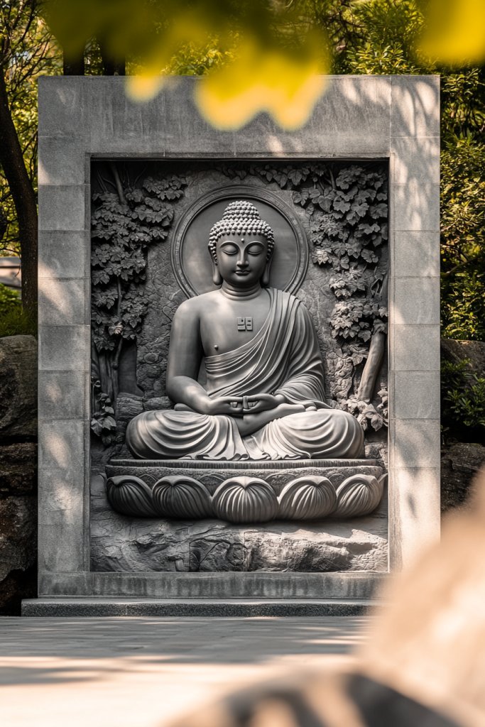 Craving a harmonious scene that exudes calm and unity? A monochrome Buddha in a garden setting offers a sophisticated, cohesive look. If your decor feels disjointed or lacks flow, this idea helps create a seamless, peaceful environment. It’s about bringing the serenity of nature and spirituality into one elegant package.