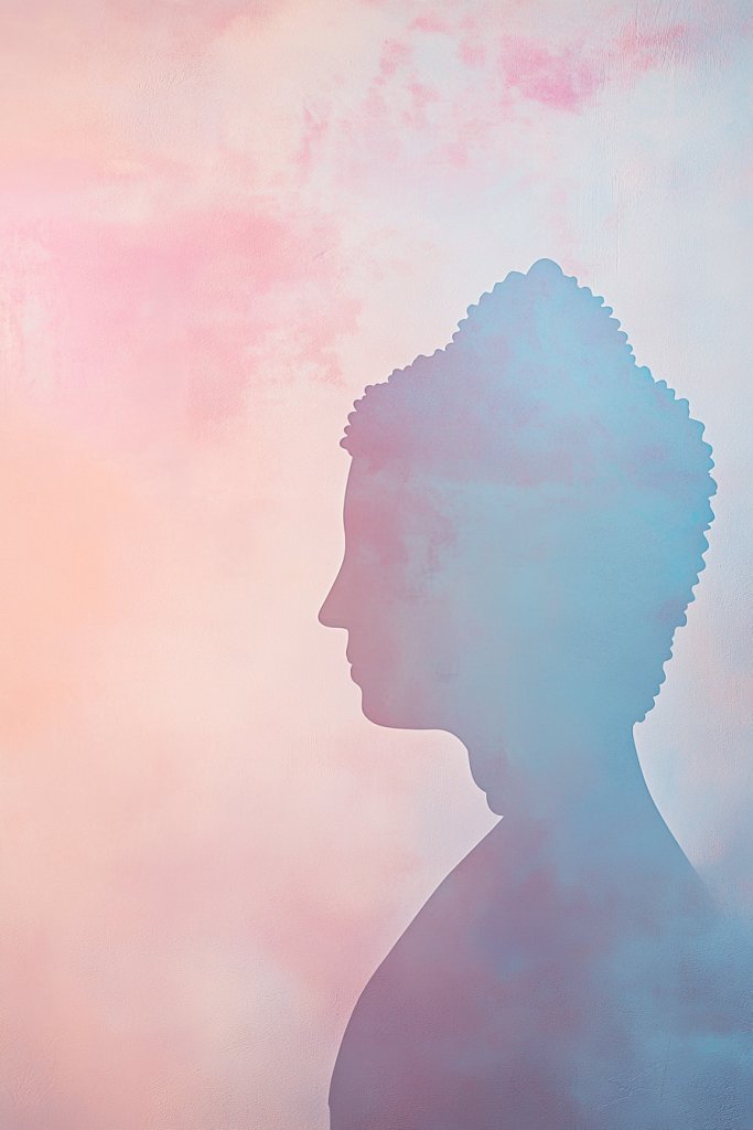Imagine a light-colored background—pale pink, mint green, or baby blue—with a simple silhouette of Buddha in a slightly darker pastel hue. The figure is soft and rounded, with no harsh lines, emphasizing tranquility. The overall scene feels airy and delicate, like a gentle whisper of calm. This minimal yet meaningful artwork enhances a cozy, feminine, or minimalist aesthetic.
