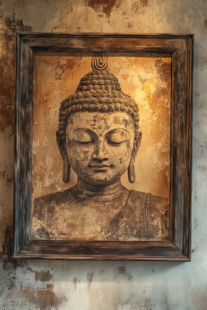 Looking for art with character and history? A vintage-inspired Buddha portrait with a distressed finish adds a nostalgic, timeless touch. If your decor feels too polished or sterile, this idea introduces warmth and personality. It’s about blending old-world charm with spiritual symbolism to create a meaningful statement piece. Who doesn’t love a bit of history?