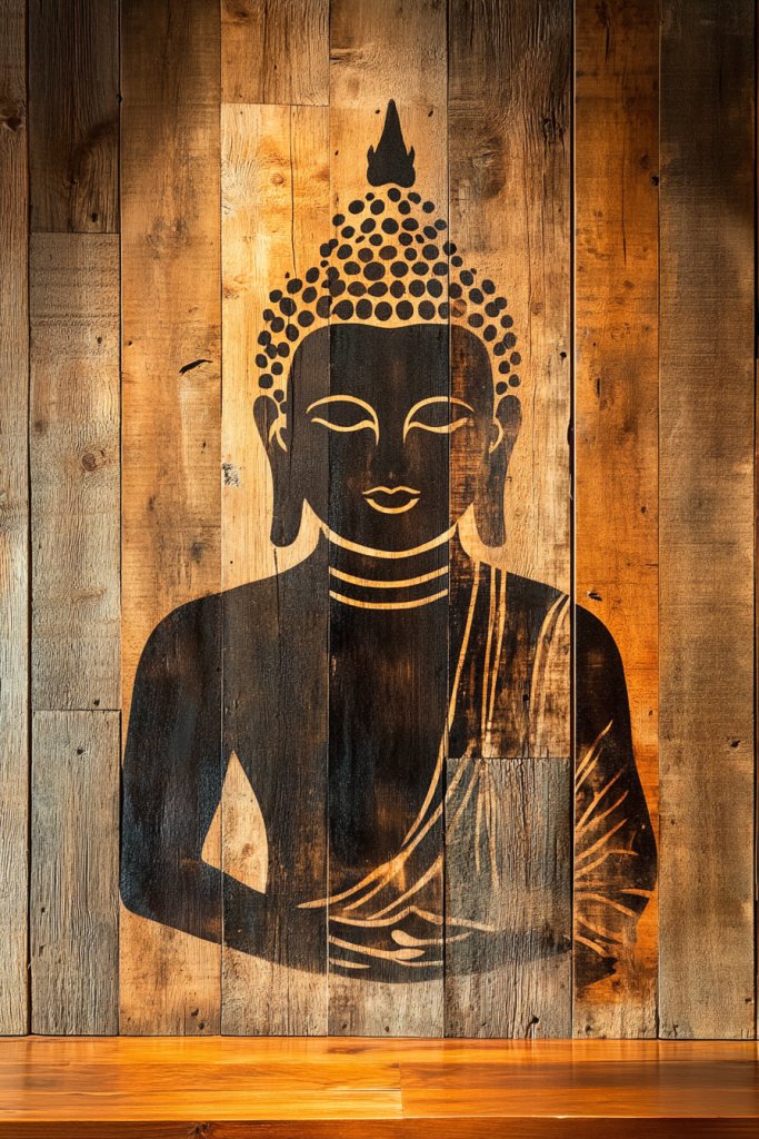 Craving a warm, earthy vibe that feels authentic and grounded? Rustic decor is all about embracing natural imperfections and raw textures. A Buddha painted or stenciled on reclaimed wood can bring a soulful, organic touch to your space. It’s perfect if you love the charm of eco-friendly, handcrafted aesthetics. Who says spiritual art can’t be rustic?