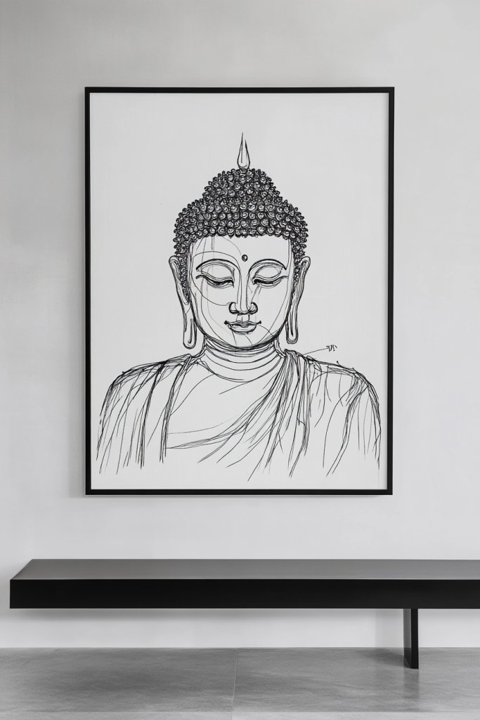 Begin with a high-quality textured paper or canvas. Use fine-tip black ink pens or markers to sketch the Buddha outline, focusing on clean, continuous lines. You can also trace a printed image for accuracy. Keep the lines smooth and confident—don’t overthink it. After completing, frame the piece simply or mount on a contrasting background for visual pop. Hang it in a well-lit area to showcase the line work.